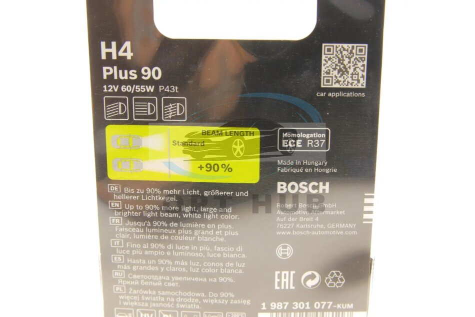 Лампа накаливания H4 12V 60/55W P43t PLUS 90 blister BOSCH