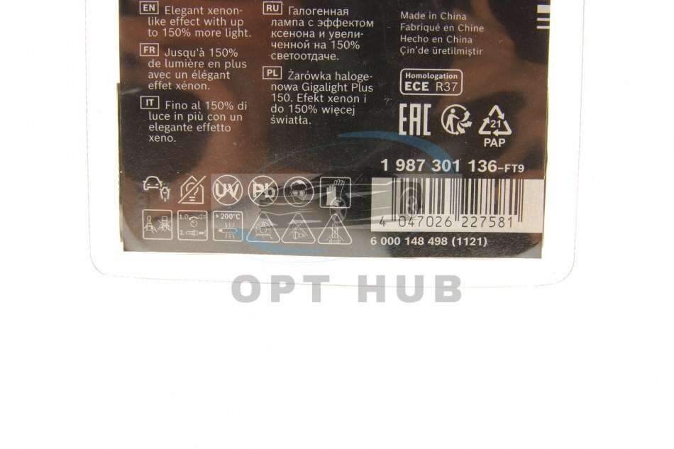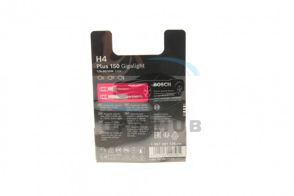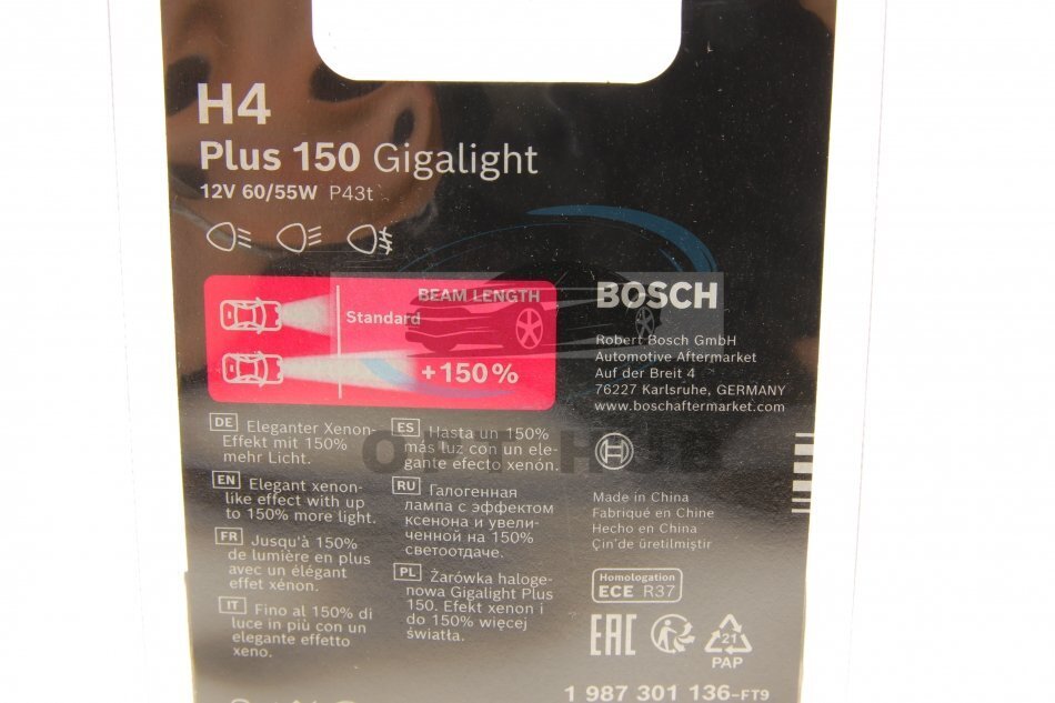 Лампа накаливания H4 12V 60/55W P43t GigaLight +150 (blister 1шт) BOSCH