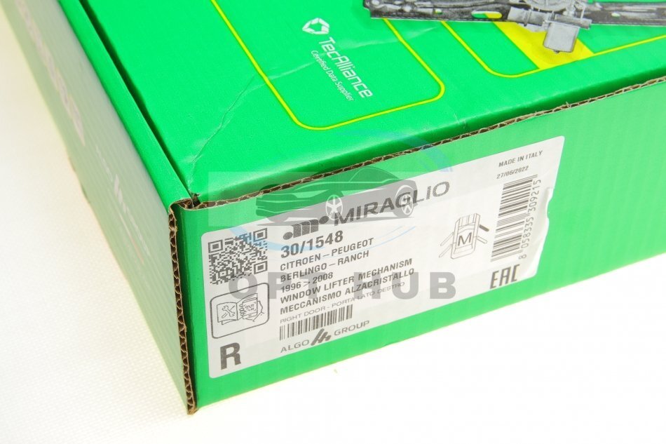 Склопідіймач (передній) Citroen Berlingo/Peugeot Partner 96- (R) (електро) (без моторчика) (opt-om) MIRAGLIO