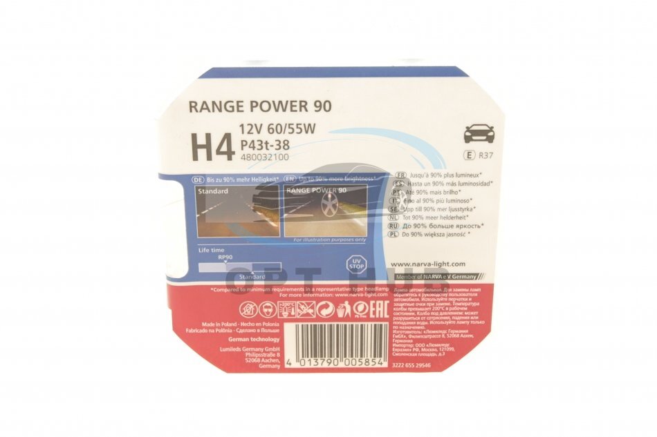 Автолампа H4 12V 60/55W P43t Range Power 90 (к-кт 2 шт)) UA63 NARVA