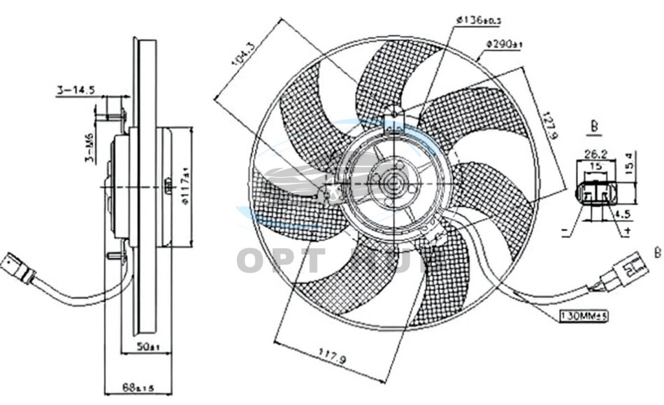 Вентилятор радіатора ВЕНТИЛЯТОР РАДИАТОРА SKODA OCTAVIA 04-. SUPERB 08-15. YETI 09-. VW CADDY 04-. GOLF 03-. JETTA 05-. PASSAT 05-14. TOURAN 03-15.LEO